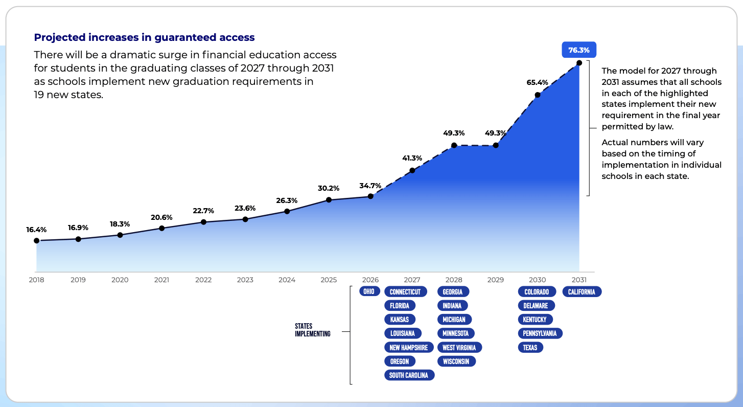 "Why high-fidelity implementation matters: Once all 30 states have implemented their requirements, an additional 45% of public high school students in the U.S. will be required to take a standalone Personal Finance course to graduate"